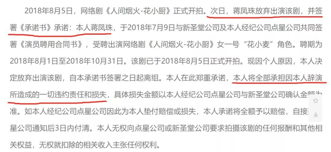 当时她还签了一份承诺书,表示承担所有因为自己辞演而造成的违约责任和损失。