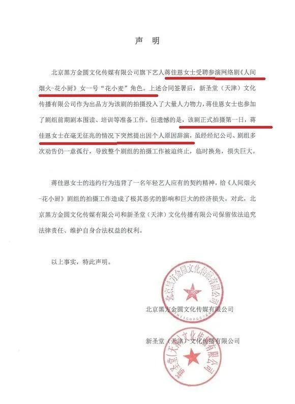 当初没演了之后,蒋佳恩的经纪公司黑方金圆文化传媒和《人间烟火花小厨》的投资方新圣堂影业还联合发表了一份声明,大概意思就是她突然辞演,给剧组的拍摄造成了很大影响,还让他们遭受了很大的经济损失,必须得追责。